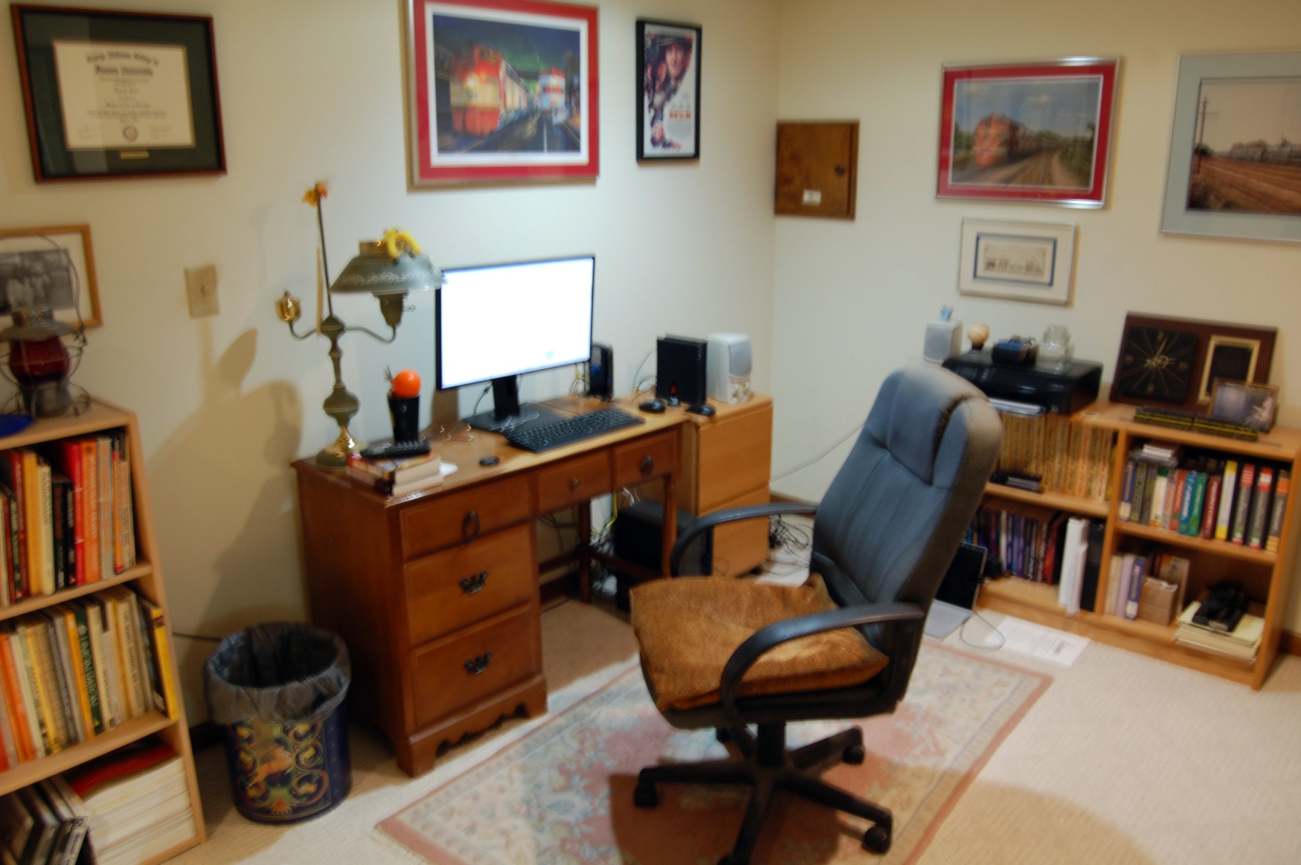 I have a spot in the basement (see photo, attached) of our home where it is completely quiet. I have a chair, a desk and a computer. Like some other people, I am easily distracted (as if a computer is not distraction enough), so no music, no pets, nothing that will cause me to lose my train of thought, or entice me to give myself a break from what I’m working on (which happens anyway)